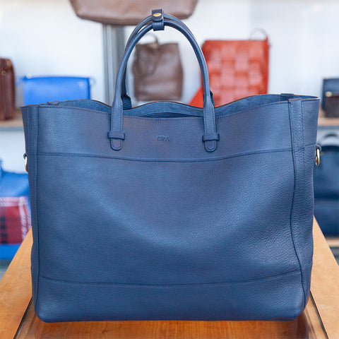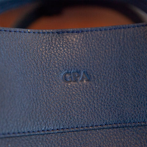 The monogram on the 929 Tote is placed on the top center of the bag, in between the two handles. The font is Times New Roman and stands about 1/4" in height. You have an option of a deboss (not pictured) or a gold foil (pictured).