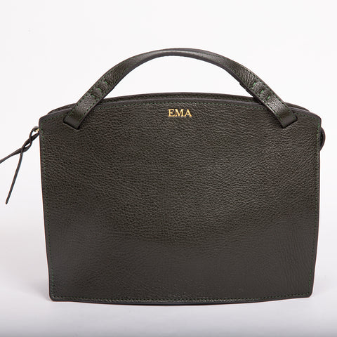 The monogram on the Sol Handbag is subtly placed on the front center of the bag. The font is Times New Roman and stands about 1/4" in height. You have the option of debossed (not pictured) and gold (pictured).